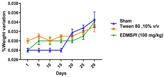 Variation in mouse weights over 28 days of the treatments used (sham, vehicle, and extract). Each bar represents the standard error of the mean, n = 5 animals. Statistic differences between the treatments were tested by two-way ANOVA, followed by a Tukey test.