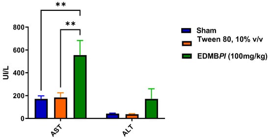 Transaminases (AST, ALT) activity to determine possible liver damage. Each bar represents the standard error of the mean, n = 5 animals. Statistically significant differences between the treatments were tested by two-way ANOVA, followed by a Tukey t-test. ** p = 0.002, 0.003.