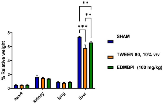 Weight variation in the different organs isolated from mice treated with three different sham (water) treatments, 10% tween 80, and EDMBPl. Each bar represents the standard error of the mean, n = 5 animals. Statistically significant differences between the treatments were tested by two-way ANOVA, followed by a Tukey test. ** p = 0.008, 0. 005; *** p < 0.001.