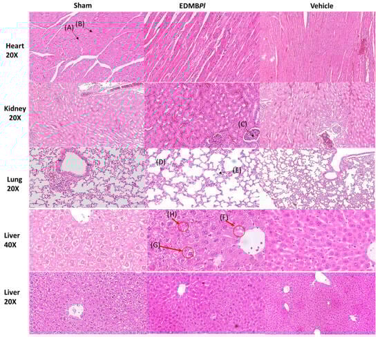 Histological sections of the different organs: the isolated heart, with muscle fibers shown (A), nuclei (B), the kidney glomerulus (C), the lung alveoli (D), and the alveolar septa (E); inflammation is observed in the hepatic artery, as well as the loss of lymphocytes close to the portal vein (F), binuclear cells (G) due to active regeneration by cell replication, hepatocytes with large nuclei (H), and active necrosis minimal, for EDMBPl.