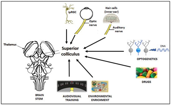 219]. In cases of visual impairment, the SC exhibits remarkable adaptability, shifting its reliance toward intact sensory modalities to maintain spatial awareness and orienting behaviors. For instance, auditory cues can enhance the detection of visual stimuli in the blind field of hemianopic patients, a phenomenon leveraged by rehabilitation protocols such as Audio-Visual Scanning Training (AViST). This technique pairs spatially and temporally congruent auditory and visual stimuli to strengthen residual subcortical pathways, particularly the retino–colliculo–extrastriate route, which remains functional even after primary visual cortex damage [