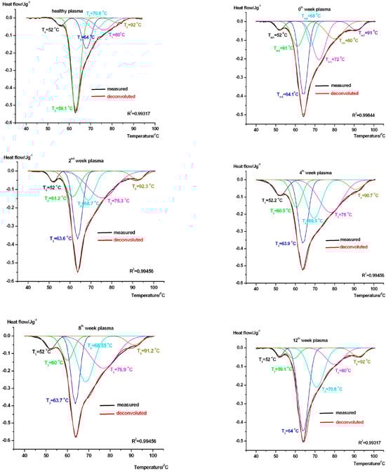Biological samples can be decomposed into main and well-known components using the deconvolution method, primarily from the summation of DSC recordings of human plasma [9]. Plasma is a complex protein mixture. Therefore, it contains, from a thermal point of view, different “thermal domains” that can be assigned to the various compounds [10]. It means that a DSC scan can be decomposed into a sum of Gaussian curves; that way, their total area is nearly the same as the experimental curve one, within a reasonable error (<1%). Checking the contribution of the different protein compounds to the total calorimetric enthalpy, we can follow the effect of medical treatments compared to the healthy control.