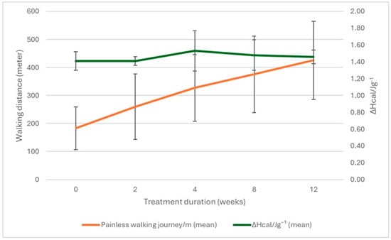 The patients’ walking distance increased during the examined period. The calorimetric enthalpy increased between weeks 2 and 4 and then slowly decreased, but it did not reach the starting point by the 12th week, as shown in Figure 2.
