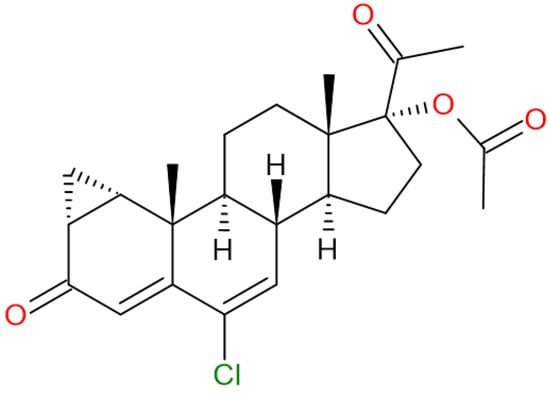 CPA is mainly an inhibitor of the interaction between androgen and androgen receptors. Furthermore, it was originally utilized to treat advanced prostate cancer because of its capacity to block the androgen receptor (AR) and thereby lower serum testosterone levels [18]. In prostate cells, CPA inhibits the binding of dihydrotestosterone to androgen receptors, thus reducing effective plasma testosterone levels. Numerous investigations have clearly demonstrated the testosterone-suppressive effectiveness of CPA, particularly at high dosages (50 mg/day) [19].