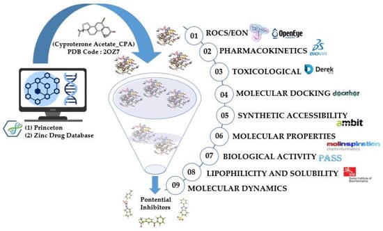In general, this article employs chemoinformatics strategies to identify new compounds with the potential to inhibit the androgen receptor. ROCS and EON filtering techniques were used in the Princeton (https://chemistry.princeton.edu/research-facilites/small-molecule-screening-center/; accessed on 22 September 2023) and Zinc Drug [24] databases, with cyproterone acetate as a comparison molecule. The selected compounds were evaluated considering their physicochemical and toxicological characteristics. The molecules that obtained the best results were subjected to molecular docking to analyze their molecular interactions and their potential as drug candidates. Figure 2 illustrates the steps adopted in the methodological system of this research.