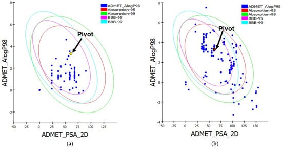 The molecule that served as the pivot (reference) for the pharmacological properties is CPA, which is indicated in the graphs. Promising candidates’ 95% and 99% confidence intervals are displayed as ellipses. The compounds detected in this area resemble those with an absorption capacity of at least 90%, a PSA value of less than 140, and an ALogP98 value of less than 5. Candidates are only chosen if they fall within the 95% to 99% confidence interval [29].