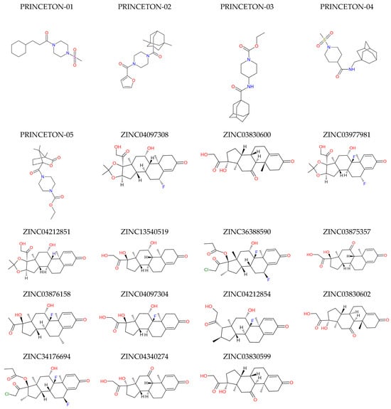 The DEREK 10.0.2 Nexus program was used to carry out the in silico toxicological investigation. Due to the presence of toxicophoric groups in the compounds, toxicity alerts were confirmed at this point in the study and generated alerts that needed further investigation. The Toxicity Class was obtained through the Protox II online server, as well as the Lethal Dose value (LD50) in mg·kg−1 [36]. These parameters were fundamental for the selection of the most promising compounds in this study. In this step, structures without warnings or that were in the toxicological class IV–VI range and presented fewer warnings of possible toxicity when compared to the reference compound were selected (see Supplementary Materials—Table S2). This resulted in 19 molecules (Figure 4) that were subjected to a molecular docking study.