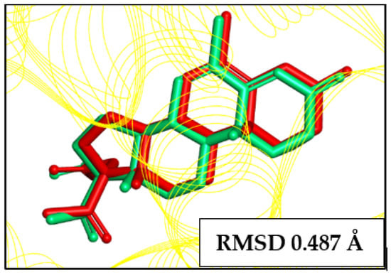 The molecular docking validation yielded satisfactory findings, as seen by the identical relative locations of the anchored and crystallographic ligands (Figure 5). The methodology was validated by the RMSD of 0.487 Å that was acquired during the optimal position redocking process [38].