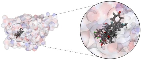 Preceding toxicological analysis, 19 molecules were selected for the molecular docking stage. To find out if the program can accurately predict the location of the ligand in the protein’s active site, redocking was required to validate the molecular docking procedure utilized in this study. This process consists of comparing the position of a co-crystallized ligand (Cyproterone Acetate-PDB code 2OZ7) with the position of a ligand anchored to the active site of the same protein. It was carried out for comparison through the structural overlap between the original structure, which contains the protein (Androgen Receptor) and the 2OZ7 inhibitor, with the result obtained in the redocking simulation using the DockThor (version 2.0) server (https://www.dockthor.lncc.br/v2/; accessed on 19 February 2024) [37].