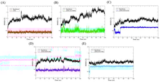 Analysis of the conformational stability of the systems over 100 ns of MD simulation. The protein backbone is represented in black in all graphs, while the colors representing the binders vary. The RMSD graphs were plotted in relation to the systems obtained after the steps of minimization, heating, and equilibrium. (A) AR-CPA, (B) AR-ZINC34176694, (C) AR-ZINC03876158, (D) AR-ZINC04097308, and (E) AR-ZINC03977981.