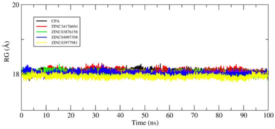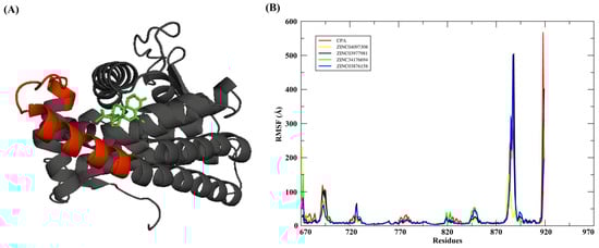 The root-mean-square deviation (RMSD) of the protein backbone was used as the primary metric to monitor the overall structural stability of each system. As illustrated in Figure 7, all complexes—AR–CPA, AR–ZINC34176694, AR–ZINC03876158, AR–ZINC04097308, and AR–ZINC03977981—exhibited mild fluctuations and stabilization within the initial nanoseconds, indicating structural convergence and the absence of ligand detachment events throughout the simulation period.
