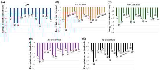 Thus far, four interesting compounds have been identified, as indicated in Table 2 (see Supplementary Material—Table S3), based on binding affinity values (ΔG) and interactions with the primary amino acid residues relative to the reference molecule.