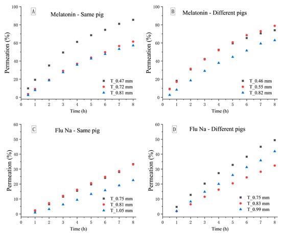 As shown in Figure 1, distinct differences in permeation profiles were observed for both melatonin and Flu-Na across nasal tissues of varying thickness. For melatonin, a clear inverse relationship between tissue thickness and permeability was evident in intra-individual comparisons (Figure 1A), where the thinnest mucosa consistently exhibited the highest permeation. A similar trend was observed across different pigs (Figure 1B); however, when thickness differences were minimal, the expected correlation was occasionally masked or even reversed due to inter-individual biological variability. Nevertheless, when thickness differences were sufficiently pronounced, melatonin permeability reliably declined with increasing tissue thickness.