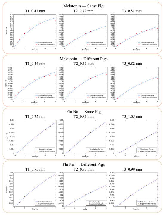 Comparison of simulated and experimental permeation profiles of melatonin and Flu-Na across porcine nasal mucosa. Simulated (blue lines) and experimental (red dots) permeation profiles of melatonin and Flu-Na are presented over an 8 h ex vivo Franz diffusion study.