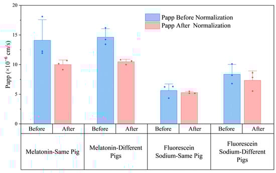 The established simulation model was adapted to the current experimental settings by incorporating actual experimental parameters, including measured mucosal thickness, donor and receptor chamber volumes, and the initial loading concentration. Permeation profiles obtained from the Franz diffusion studies were fitted using the numerical model to generate permeability parameters characterizing drug transport behavior under a standardized thickness. The consistency between experimental and simulated curves is shown in Figure 2. The estimated parameter values derived from the simulation are provided in Supplementary Data Table S1, and detailed theoretical definitions and mathematical assumptions are available in our previous work [26]. Using this simulation approach, the Papp of each sample was normalized to a reference mucosal thickness of 0.80 mm. Papp values before and after thickness normalization are compared in Figure 3 to illustrate the effectiveness of the model in reducing intra- and inter-sample variability.