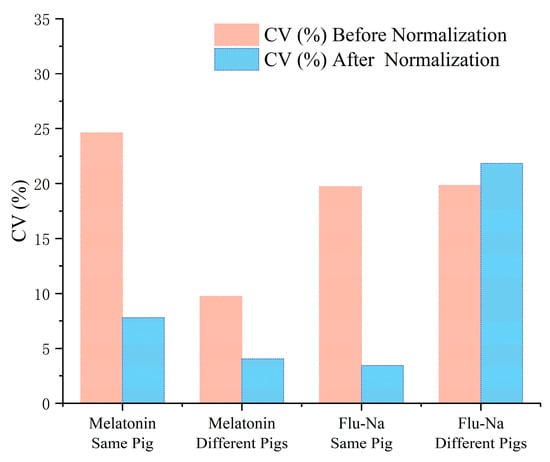 Figure 4 further illustrates the effect of thickness normalization on the variability of Papp estimates, as measured by the coefficient of variation (%). For melatonin, normalization substantially reduced variability in both intra- and inter-individual groups, with CV decreasing by 16.8% in the same-pig group and by 5.7% in the different-pig group. These results confirm that mucosal thickness was a primary contributor to experimental variability for melatonin and that simulation-based normalization effectively enhanced data consistency. In contrast, the response to normalization was compound dependent. For Flu-Na, normalization successfully reduced intra-individual variability (CV 19.72% → 3.43%) but failed to reduce variability in the inter-individual group, where CV paradoxically increased (19.83% → 21.85%).