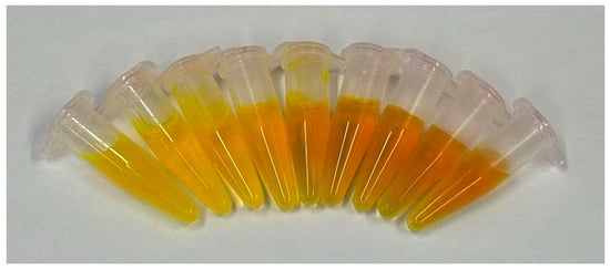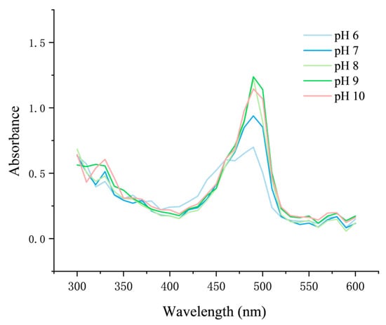 Further characterization revealed that Flu-Na exists predominantly in an ionized form under physiological conditions, with its degree of protonation varying with pH and significantly affecting its log D values. As the pH increased from 6.0 to 10.0, deprotonation enhanced hydrophilicity, resulting in progressively more negative log D values. These protonation-dependent structural changes also influenced the solution color (Figure 7) and the UV-visible absorption spectra (Figure 8). Spectral scans across the 300–600 nm range revealed pronounced absorbance differences at the peak wavelength. Therefore, for accurate quantification, all measurements were conducted at the same pH to ensure consistency. Previous studies similarly reported that the log P of fluorescein decreased from approximately 2.78 at pH 4.29 to −0.08 at pH 7.5 [37], supporting the pH-dependent shift in partitioning behavior observed for Flu-Na.