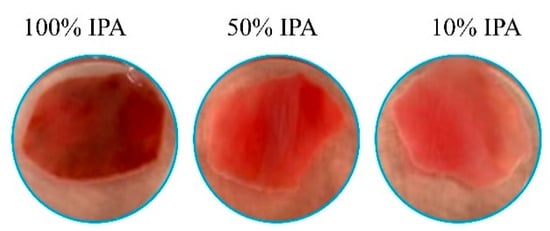 For each experimental set, three pieces of nasal mucosa tissue from the same pig were submerged in 3 mL of IPA at concentrations of 10%, 50%, or 100% for 30 min to induce graded levels of epithelial damage. A parallel control tissue sample from the same pig was submerged in 3 mL of DPBS under identical conditions. Following exposure, all tissues were thoroughly rinsed with DPBS to remove residual solvent and were immediately mounted in Franz diffusion cells for permeability testing.