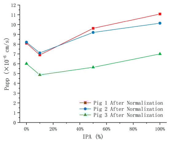 To systematically investigate this issue, nasal mucosa tissues harvested from the same pig were immersed in 10%, 50%, or 100% IPA for 30 min to induce graded levels of chemical damage. A parallel control sample was incubated in DPBS under identical conditions. Flu-Na permeability was then measured as an indicator of mucosal integrity. This experiment was independently repeated in tissues from three different pigs to ensure reproducibility. Representative images of nasal mucosa following IPA-induced damage are shown in Figure 9, and the corresponding Papp values, normalized to a standardized mucosal thickness of 0.80 mm, are presented in Figure 10.