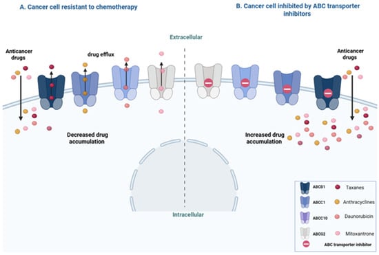 Multidrug resistance (MDR) is known as reduced or lack of response to the therapeutic action of anticancer drugs that are structurally and mechanistically unrelated. MDR is to this day a significant challenge in chemotherapy, often leading to a less-than-optimal response, relapse, and mortality. The mechanisms underlying MDR are complicated and in some cases not completely understood, with the exception of the mechanism involved in the enhanced expression of ATP-binding cassette (ABC) transporters [1,2]. Acquired and inherent MDR—the latter also known as intrinsic—have been extensively studied for over 50 years [3,4]. Key early discoveries include the identification of membrane transporters that confer resistance to multiple drugs [5]. Researchers later identified P-glycoprotein (P-gp) as one such transporter, which was later referred to as multidrug resistance protein 1 (MDR1) or ATP-binding cassette subfamily B member 1 (ABCB1) [6,7]. Since then, P-gp has been the most studied transporter and a notable MDR mechanism. Subsequent studies revealed other members of this family of transporters, e.g., breast cancer resistance protein (BCRP/ABCG2) and multidrug resistance-associated protein 1 (MRP1/ABCC1), which have expanded our understanding of the cell repertoire of transporter proteins [7,8,9,10,11].
