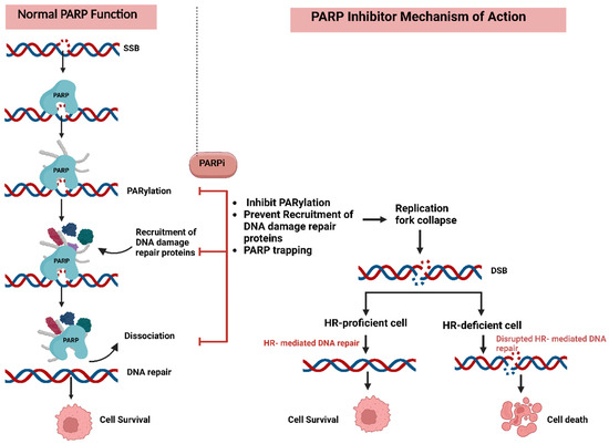 Poly (ADP-ribose) polymerase (PARP) enzymes are important molecules in repairing single-strand DNA breaks (SSBs) through the base excision repair pathway [90]. Inhibiting PARP results in the accumulation of double-strand DNA breaks (DSBs) during replication, which are repaired by homologous recombination (HR). Tumors with HR deficiencies, such as brca1/2 mutations, are particularly vulnerable to PARP inhibitors (PARPis) due to their inability to repair double-stranded breaks, which results in cell death. This “synthetic lethality” phenomenon has been a foundation for the development of PARP inhibitors [90,92]. The first approved PARP inhibitor, olaparib, demonstrated significant efficacy in BRCA-mutated ovarian cancers and laid the basis for the development of other inhibitors (e.g., talazoparib, niraparib, and rucaparib). These agents have shown clinical utility in pancreatic, prostate, and breast cancers (Figure 2) [93].