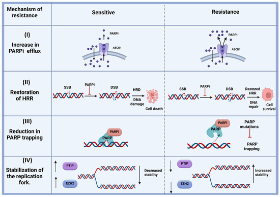 Mechanisms of resistance to PARP inhibitors (PARPis). (I) Increased PARPi efflux: Some PARPis, such as olaparib, are substrates of MDR1 (P-gp). By upregulating the activity of MDR1, these cells can effectively pump the drug out of the cancer cells, contributing to resistance. (II) Restoration of homologous recombination repair (HRR): The concept of synthetic lethality relies on the combination of HRR deficiency and PARP inhibition. When HRR is restored in cancer cells due to factors such as reversion mutation, DNA damage can be repaired through the HRR pathway. This repair allows cancer cells to survive, rendering them resistant to PARP inhibitors. (III) Reduction in PARP trapping: Mutations in PARP may reduce its ability to bind to PARPis, thereby reducing PARP trapping. These mutated forms of PARP can recruit other DNA repair proteins to repair single-strand breaks, resulting in PARPi resistance and enhanced cell survival. (IV) Stabilization of the replication forks: Certain HRR-related proteins also contribute to the stabilization of stalled DNA replication forks. In HRR-deficient cells, which are sensitive to PARPis, stalled replication forks are typically degraded by DNA nucleases (DSB: double-strand break; EZH2: Enhancer of Zeste Homolog 2; HRD: homologous recombination deficiency; HRR: homologous recombination repair; PTIP: Pax2 transcription-interacting protein; SSB: single-strand break).