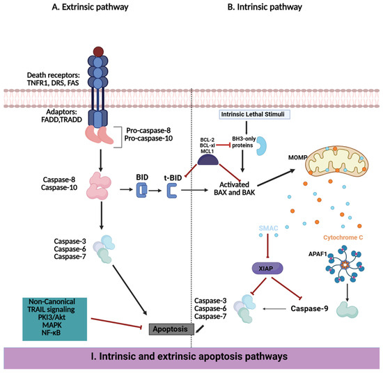 Apoptosis has a fundamental role in tissue homeostasis by eliminating abnormal or damaged cells. In cancer, disruption of apoptosis mechanisms contributes to unchecked cell proliferation and therapeutic resistance. Apoptosis is regulated through two interrelated pathways: the intrinsic (mitochondrial) pathway and the extrinsic (death receptor) pathway, both of which ultimately activate caspases that disassemble the cells (Figure 4I) [149,150,151]. The B-cell lymphoma 2 (BCL-2) protein family regulates the intrinsic apoptotic pathway, which governs mitochondrial outer membrane permeabilization. Pro-apoptotic proteins (e.g., BAK and BAX) facilitate cytochrome c release, which activates caspase, and anti-apoptotic proteins (e.g., BCL-2 and BCL-XL) counteract this mechanism [151,152,153]. On the other hand, the extrinsic pathway is triggered by the binding of extracellular ligands to death receptors (e.g., Fas and tumor necrosis factor receptor, or TNFR), which leads to the activation of caspase-8 and downstream apoptotic events [152,153,154]. Apoptotic dysregulation in cancer can be generated through various mechanisms, which include loss of pro-apoptotic regulators, overexpression of anti-apoptotic proteins (for example, MCL-1, BCL-2), and defects in death receptor signaling. Such alterations enable cancer cells to evade cell death even in the presence of therapeutic interventions or genomic stress (Figure 4II) [155,156]. In a clinical study in 57 newly diagnosed acute myeloid leukemias, low BCL-2 expression levels predicted longer Progression-Free Survival (PFS) (p = 0.02) and longer overall survival (p = 0.06) [125].