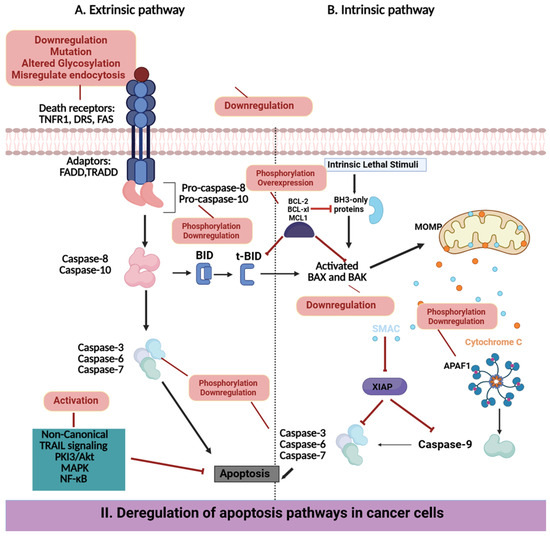 (I) Extrinsic and intrinsic apoptosis pathway. External ligands such as TRAIL or FasL bind to death receptors, triggering the recruitment of FADD, which activates initiator caspase-8 and -10. The active forms of caspase-8 and -10 then cleave and activate effector caspases, such as caspase-3, -6, and -7, thereby executing apoptosis. Moreover, caspase-8 cleaves Bid, promoting the oligomerization of Bax and Bak on the outer mitochondrial membrane. This promotes the release of cytochrome c, leading to the activation of caspase-9 and subsequently amplifying the apoptotic signal through further activation of effector caspases. Intrinsic apoptosis can also be initiated by BH3-only proteins, which inhibit the activity of anti-apoptotic proteins like Bcl-2 and Bcl-XL, thereby enabling Bax and Bak to initiate mitochondrial outer membrane permeabilization and cell death. Additionally, inhibitory proteins like XIAP suppress apoptosis by directly preventing the activation of caspases. (II) Deregulation of extrinsic and intrinsic apoptosis pathways: The delicate balance between pro-apoptotic and anti-apoptotic signaling molecules is usually disrupted in cancer cells. This deregulation arises from alterations at the transcriptional level, such as abnormal DNA methylation, and at the post-translational level, which together contribute to the evasion of apoptosis.