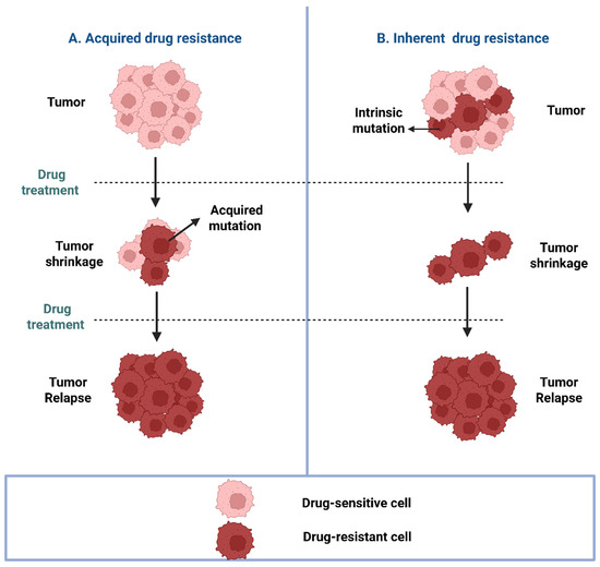 A schematic representation of inherent and acquired drug resistance: In inherent resistance, tumor cells are inherently resistant due to pre-existing mutations. Conversely, acquired resistance arises when tumor cells develop mutations in drug targets during or following therapeutic exposure.