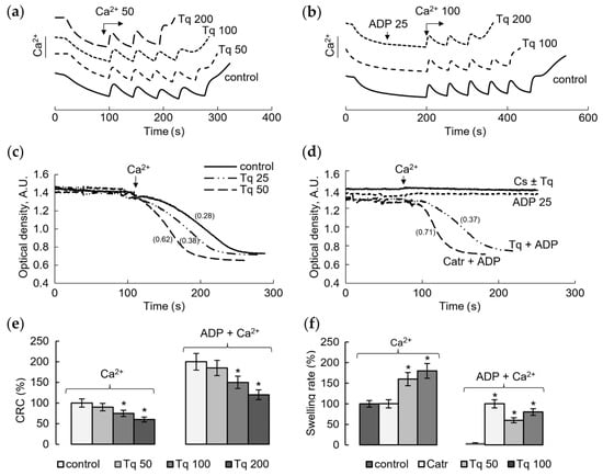 Influence of Tq on the Ca2+-induced mPTP opening. The calcium retention capacity (CRC) of mitochondria in the course of successive additions of 50 μM CaCl2 in the control (a) and upon supplementation of 25 μM ADP and additions of CaCl2, at a concentration of 100 μM each (b), in the presence of Tq at the indicated concentrations; the influence of Tq on the Ca2+-induced (50 μM) mitochondrial swelling in control mitochondria (c) and in the presence of mPTP inhibitors Cs A (1 µM), ADP (25 µM), and Catr (1 µM) (d); the influence of Tq at different concentrations on the calcium load (e) and the rate of mitochondrial swelling (f) in the control and in the presence of ADP. An asterisk (*) indicates the values ± S.D. that differ significantly from the control values (p < 0.05); the swelling rates (Δ540 nm/min) are indicated in parentheses; all measurements were carried out in a buffer containing 125 mM KCl, 15 mM HEPES, 1.5 mM phosphate, and 5 mM succinate.