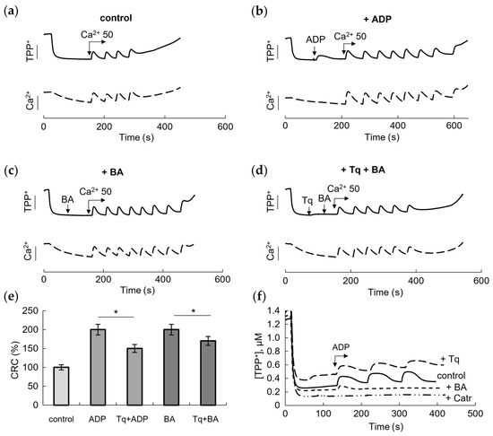 Influence of Tq and bongkrekic acid (BA) on the membrane potential and Ca2+-induced mPTP opening. Changes in the membrane potential and the calcium retention capacity (CRC) of mitochondria during successive additions of 50 μM CaCl2 in the control (a), upon supplementation of 25 μM ADP (b), 10 μM bongkrekic acid (BA) (c) and 100 μM Tq with BA (d). Comparison of the effects of Tq and inhibitors on the CRC (e) and ADP-induced decrease/restoration of the membrane potential (f). An asterisk (*) indicates the values ± S.D. that differ significantly from the control values (p < 0.05).