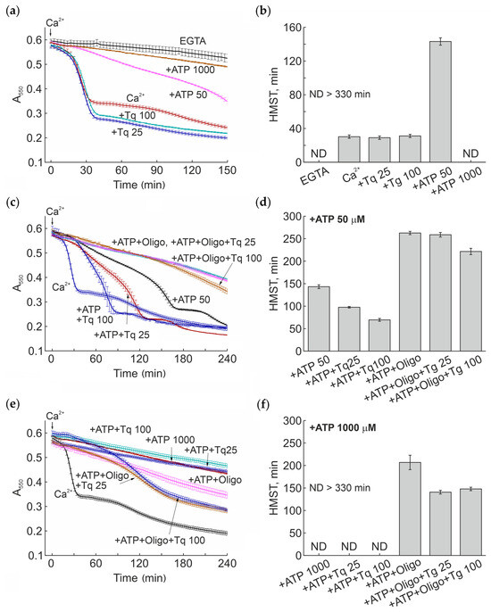 Figure 3 shows that, in the presence of Ca2+ at a low subthreshold concentration, Tq minimally affected the rate of mitochondrial swelling (half-maximum swelling time (HMST), i.e., the time when half the mitochondria become swollen due to PTP opening) (Figure 3a,b). Simultaneously, Tq increased the amplitude of swelling. As shown, ATP strongly and dose-dependently inhibited the swelling: 50 µM and 1 mM ATP increased the HMST by about 5-times and by more than 11-times, respectively. In the presence of 1 mM ATP, the half-maximum swelling was not observed during the experiments. In turn, Tq dose-dependently decreased the inhibitory effect of a low (50 µM) ATP concentration (by about two-times) (Figure 3c,d) but was unable to lower the effect of a high (1 mM) concentration (Figure 3e,f). Oligomycin, an inhibitor of F-ATP synthase, increased and decreased the protective effect of ATP at low and high concentrations, respectively (Figure 3c–f). In the presence of 1 mM ATP, Tq significantly accelerated the mitochondrial swelling induced by the presence of oligomycin. Under these conditions, Tq activated the swelling already at a concentration of 25 μM (Figure 3e,f). These data show that Tq stimulates the pore opening upon prolonged incubation in the presence of subthreshold concentrations of calcium ions and a low ATP concentration, while at physiological concentrations of ATP, the effect of Tq was not evident but could be activated by oligomycin.