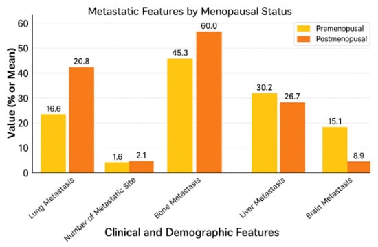 Table 2 presents the statistical comparisons of metastatic sites between the groups, while Figure 2 offers a visual summary of these differences for easier interpretation of distribution patterns by menopausal status. Table 2 compares metastatic regions in breast cancer patients by menopausal status. The difference between the postmenopausal and premenopausal patients in terms of frequency of lung metastasis is statistically significant (p = 0.038). Regarding metastatic sites, there is also a big difference between the postmenopausal and premenopausal patients, as there are 2.07 ± 1.21 sites (mean ± SD) against postmenopausal patients and 1.58 ± 1.05 in premenopausal patients (p = 0.030), which indicates greater metastatic spread post menopause. No other metastatic sites, including bone (45.3 vs. 60.0%, p = 0.211), liver (30.2 vs. 26.7%, p = 0.873), and brain (15.1 vs. 8.9%, p = 0.532), differed significantly between the groups (p > 0.05). In other words, these findings indicate that postmenopausal patients are more likely to develop lung metastasis and a more significant number of metastatic sites, which is potentially indicative of differing aggressiveness or hormonal influences in the disease. Nevertheless, while having no significance in other areas, these patterns of metastases do not uniformly indicate the effect of menopausal status, suggesting that further study into underlying biological factors is warranted [10].