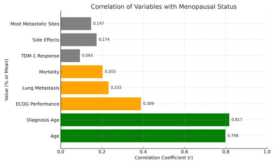 A correlation map displaying the strength and direction of the associations between menopausal status and various clinical parameters is shown in Figure 5. Significant positive correlations were identified for age, ECOG performance, lung metastasis, and mortality.