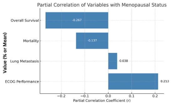A graphical output showing partial correlation coefficients after adjusting for age is shown in Figure 6. No significant independent associations were observed between menopausal status and performance status, metastasis, mortality, or survival outcomes.