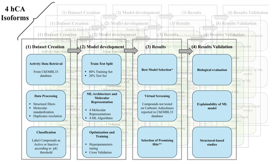 Nonetheless, despite the widespread application of artificial intelligence in drug discovery, the use of ML to target CAs still presents significant opportunities for improvement. To date, only a limited number of studies have employed ML to specifically target hCAs, although with different objectives and applications. Over time, efforts have been undertaken to broaden the scope. Indeed, ML models developed by Kırboğa and Işık, and those reported by Kim and co-workers targeted two isoforms, specifically hCA I and hCA II [12,13]. The former study was purely computational and investigated the impact of small structural components in the inhibitory activity and potency of molecules. The latter used the developed models to identify dual inhibitors of kinases and CAs for anticancer therapy, despite the principal isoforms implicated in tumorigenesis being hCA IX and hCA XII. The work of Galati and co-workers addressed the challenges associated with oncological treatments involving hCAs by developing an ML model designed to predict selectivity for hCA IX over hCA II, offering a more targeted approach for the development of selective inhibitors [14]. Tinivella and collaborators, on the other hand, developed ML models capable of predicting activity against three isoforms: hCA II, hCA IX, and hCA XII [15].