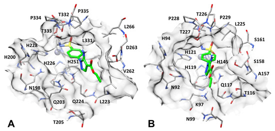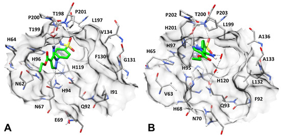 Predicted binding mode of compound 1 in hCA IX (A) and XII (B). In each panel, the ligand is shown in green, the binding site residues are displayed in gray, the surface of the binding cavity is shown in transparency, and H-bonds are displayed as black dashed lines.