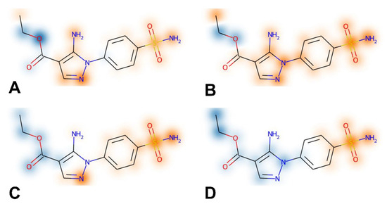 Results obtained from the SHAP analysis for compound 1 related to its prediction of activity against hCA II (A), I (B), IX (C), and XII (D). The orange-colored moieties indicate a positive impact on the prediction, whereas blue-colored moieties indicate a negative one.