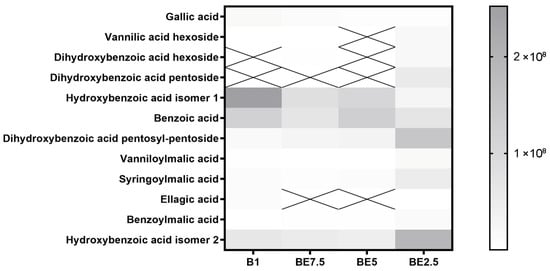 Figure 1). The most abundant and consistent compounds among those found are benzoic acid and hydroxybenzoic acid isomer 1, dihydroxybenzoic acid pentosyl-pentoside, especially in B1 and BE5 samples. This suggests that these relatively simple phenolic acids are easily extracted across a range of polarities, with a slight preference for mid-polar systems. Good solubility in ethanol-rich solutions is indicated by the moderate and uniform distribution of hydroxybenzoic acid isomer 2, and dihydroxybenzoic acid pentoside, vanillic acid hexoside, dihydroxybenzoic acid hexoside. Their increased polarity and affinity for ethanol-enriched solvents are reflected in their more pronounced extraction in BE2.5. All extracts include very low intensities of compounds, such as gallic acid, benzoylmalic acid, syringoylmalic acid, and vanilloylmalic acid, with no clear solvent preference. BE2.5 demonstrates the broadest and most balanced extraction capacity for benzoic acid derivatives, recovering both free acids and more polar glycosylated forms. These findings highlight the importance of tuning solvent polarity to target specific subgroups within the phenolic acid class and underscore the potential of mixed alcohol systems for comprehensive phytochemical recovery.