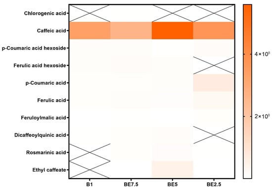 Caffeic acid is found in all four extracts and has the maximum intensity in BE5, followed by BE2.5 and B1, with the lowest signal in BE7.5, according to the heatmap of cinnamic acid derivatives (