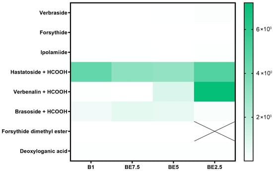 Figure 3) shows a distinct polarity-dependent extraction pattern, with BE2.5 and, to a lesser extent, BE5 showing the most effective recovery. Out of all the chemicals listed, hastatoside + HCOOH has the largest and most stable abundance in all four extracts, peaking in BE2.5. Its high natural content and generally advantageous solubility in a range of polarities are highlighted by its extensive presence across extraction techniques. The second most common compound is verbenalin + HCOOH, whose extraction gets better over time from B1 to BE2.5. Its polarity and the beneficial effects of ethanol on solubilization and matrix permeability are evident in this trend. The appropriateness of mid-ethanol concentrations for the extraction of glycosidic iridoids is further supported by the low to moderate quantities of brasoside + HCOOH that are present in all extracts, with a minor enrichment in BE7.5 and BE5. The examined sample also contains other iridoid glycosides, including verbraside, forsythide, and ipolamiide. The fact that forsythide dimethyl ester is completely undetectable as well (designated with a “X” in BE2.5) highlights the solvents selectivity. The findings show that the best extracts for obtaining the main iridoid glycosides from