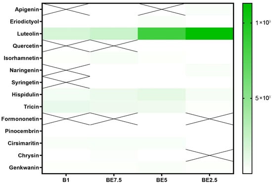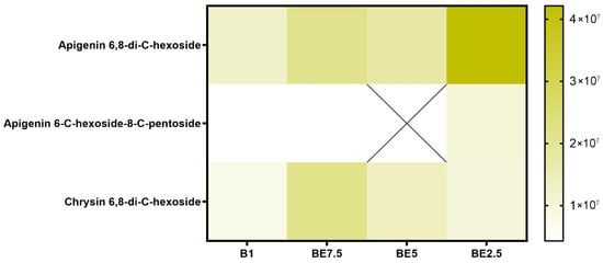Figure 7). It can be found in smaller quantities in BE7.5 and B1, but it is most prominent in BE5, with much greater intensity in BE2.5. Given the comparatively low polarity of flavonoid aglycones, this pattern is a little surprising, but it implies that luteolin may still prefer ethanol-rich solvents even though it is an aglycone because it contains several hydroxyl groups, which provide intermediate polarity. Given its great abundance, it is evident that