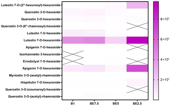 O-hexuronide is the most prevalent and reliably extracted flavonoid of the components listed; it is especially prominent in BE2.5, where it reaches its maximum intensity (