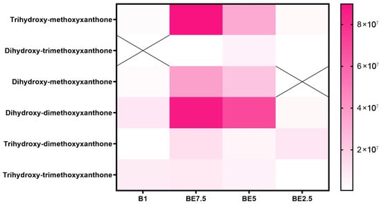 Figure 8) shows a profile of these phenolic chemicals that is extract-specific but generally balanced. The most prevalent molecules are trihydroxy-methoxyxanthone and dihydroxy-dimethoxyxanthone, which are especially abundant in the BE7.5 extract. BE5 has a considerable presence of these compounds, and B1 and BE2.5 have modest detection of them. This pattern suggests that these xanthones are best extracted using a moderately polar solvent composition (75:25 butanol:ethanol), most likely because of their amphipathic nature brought on by both hydroxyl and methoxy substitutions.
