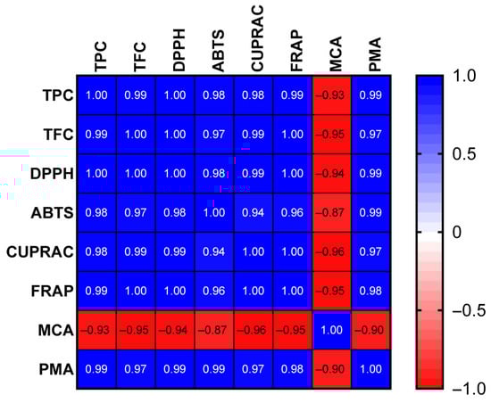 2 > 0.8). This observation highlighted that phenolic compounds were the primary contributors to the antioxidant properties of