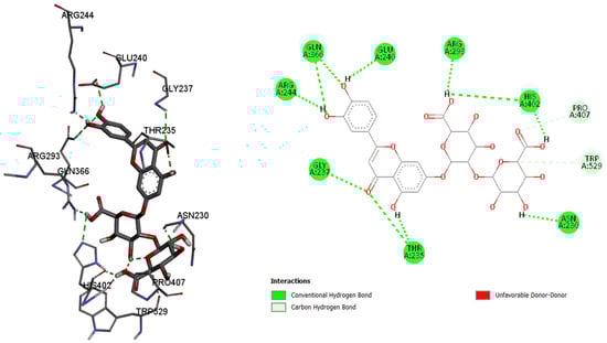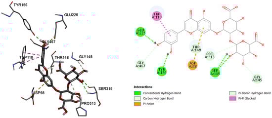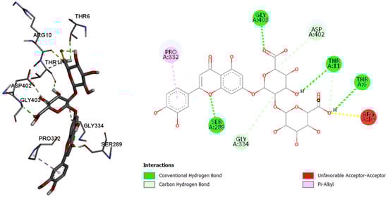 Like in the other two previously tested enzymes, in this case, luteolin 7-O-(2″-glucuronyl)-glucuronide showed the best binding affinity among the six tested compounds. By comparing with the control molecule, 3,5,7-trihydroxy-2-(3,4,5-trihydroxyphenyl)-4H-chromen-4-one, 7-O-(2″-glucuronyl)-glucuronide showed better binding affinity to the pancreatic alpha amylase, with the binding energy of −9.5 kcal/mol (comparing to the control molecule binding energy of −7.8 kacl/mol), binding with the six amino acids and their residues in the active site of enzyme via conventional and carbon hydrogen, as well as other bonds.