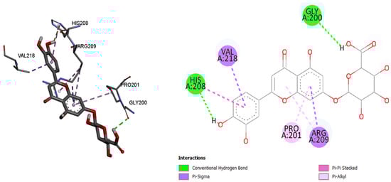 As in the case of tyrosinase, luteolin-7-O-glucuronide showed the best binding affinity (binding energy of −7.9 kcal/mol) by comparing it with the other tested molecules. Luteolin-7-O-glucuronide bind to the active site of tyrosinase via conventional hydrogen bonds (208His and 200His), π–sigma, π–π stacked, and π–alkyl bonds (218Val, 201Pro, and 209Arg). Luteolin-7-O-glucuronide showed better bind affinity compared to the control compound kojic acid (binding energy −5.4 kcal/mol).