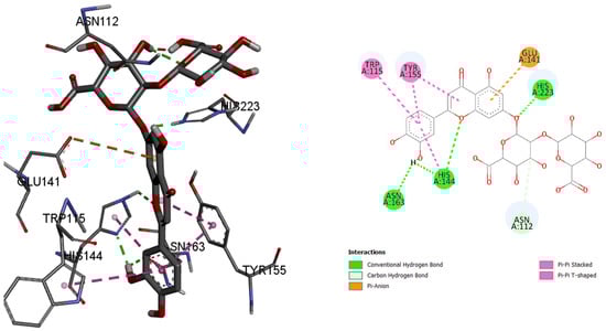 In the case of enzyme elastase B from P. aeruginosa, luteolin 7-O-(2″-glucuronyl)-glucuronide had best binding affinity with the binding energy of −9.6 kcal/mol, making this ligand a better ‘binder’ to the active site of the enzyme instead of the co-crystalized control molecule. Luteolin 7-O-(2″-glucuronyl)-glucuronide binds to the active site via hydrogen bonds and π–type bonds (115Trp, 155Tyr, 163Asn, 144His, 112Asn, 141Glu, and 223His).