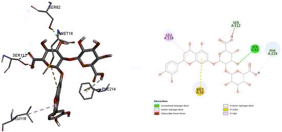 Furthermore, in the case of lipase A from P. aeruginosa, best binding affinity to the active site of the enzyme had luteolin 7-O-(2″-glucuronyl)-glucuronide, with the binding energy of −8.5 kcal/mol. This molecule also had better binding energy compared to the control molecule binding energy of −6.1 kacl/mol. Only five amino acids and their residues play roles in binding this molecule: 118Leu, 112Ser, 82Ser, 214Phe, and 16Met.
