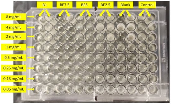Table 4 displays the minimum bactericidal concentrations (MBC) and minimum inhibitory concentrations (MIC) of four extracts (B1, BE7.5, BE5, and BE2.5) that were evaluated against